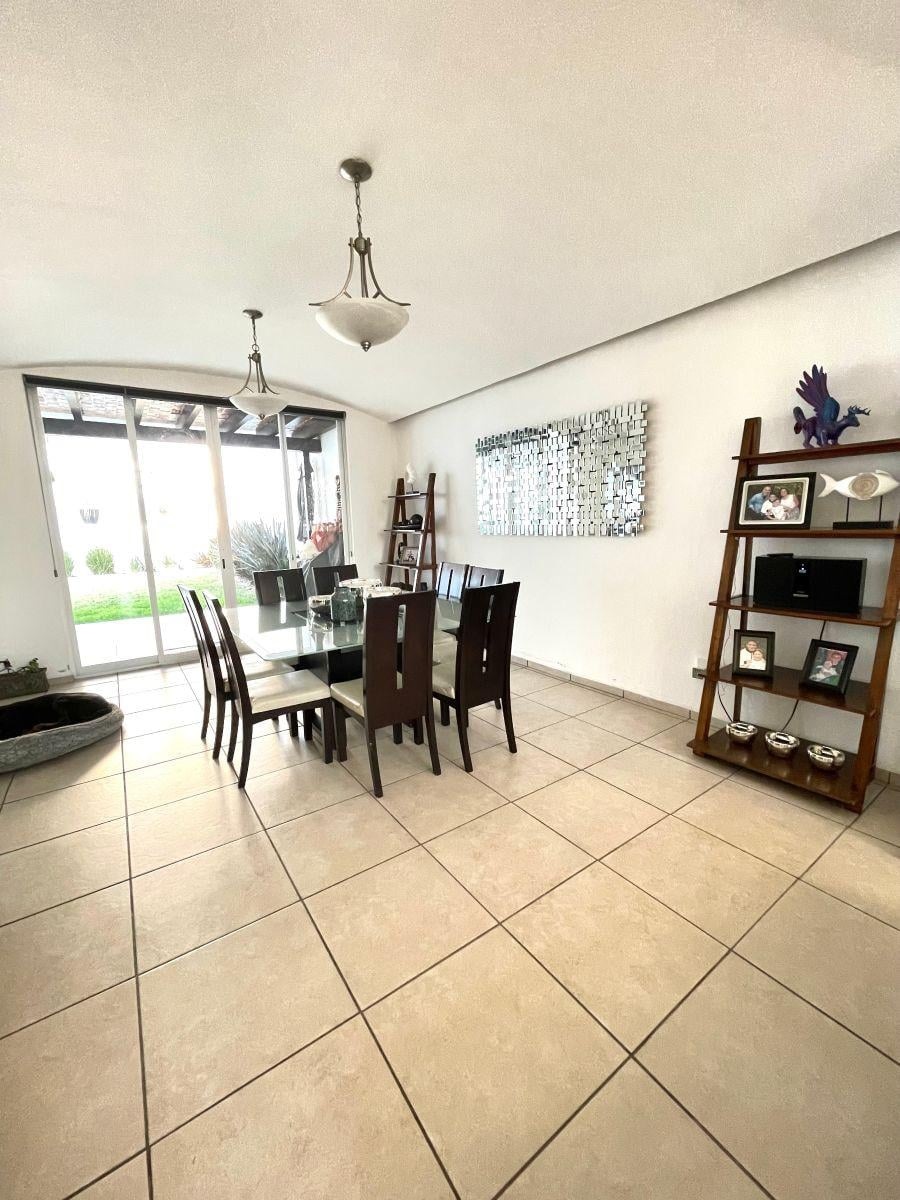 En planta baja encontrarás sala y comedor corridos; la sala tiene doble altura y chimenea eléctrica, lo que hace el espacio más cálido y agradable. La cocina es amplia, equipada y con buena capacidad de alacena; tiene vista al jardín y espacio para desayunador.