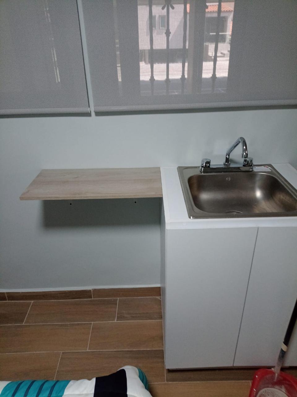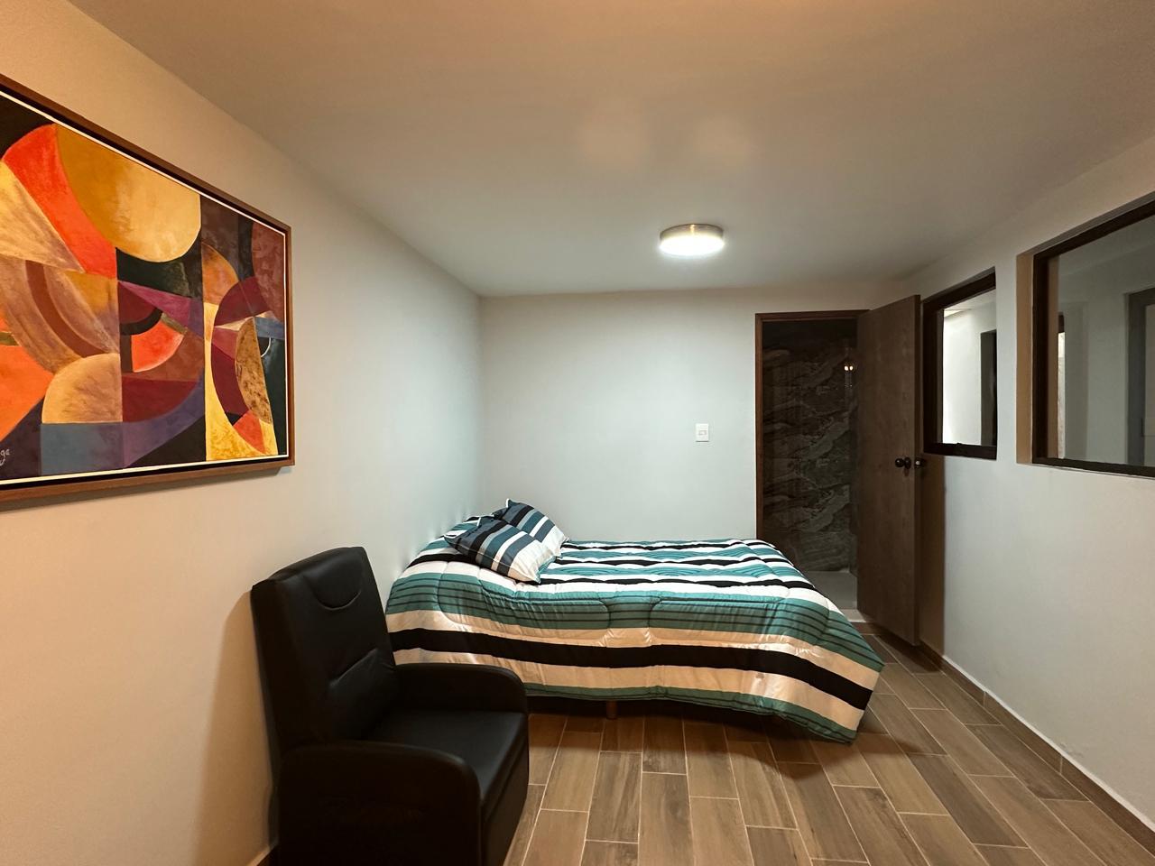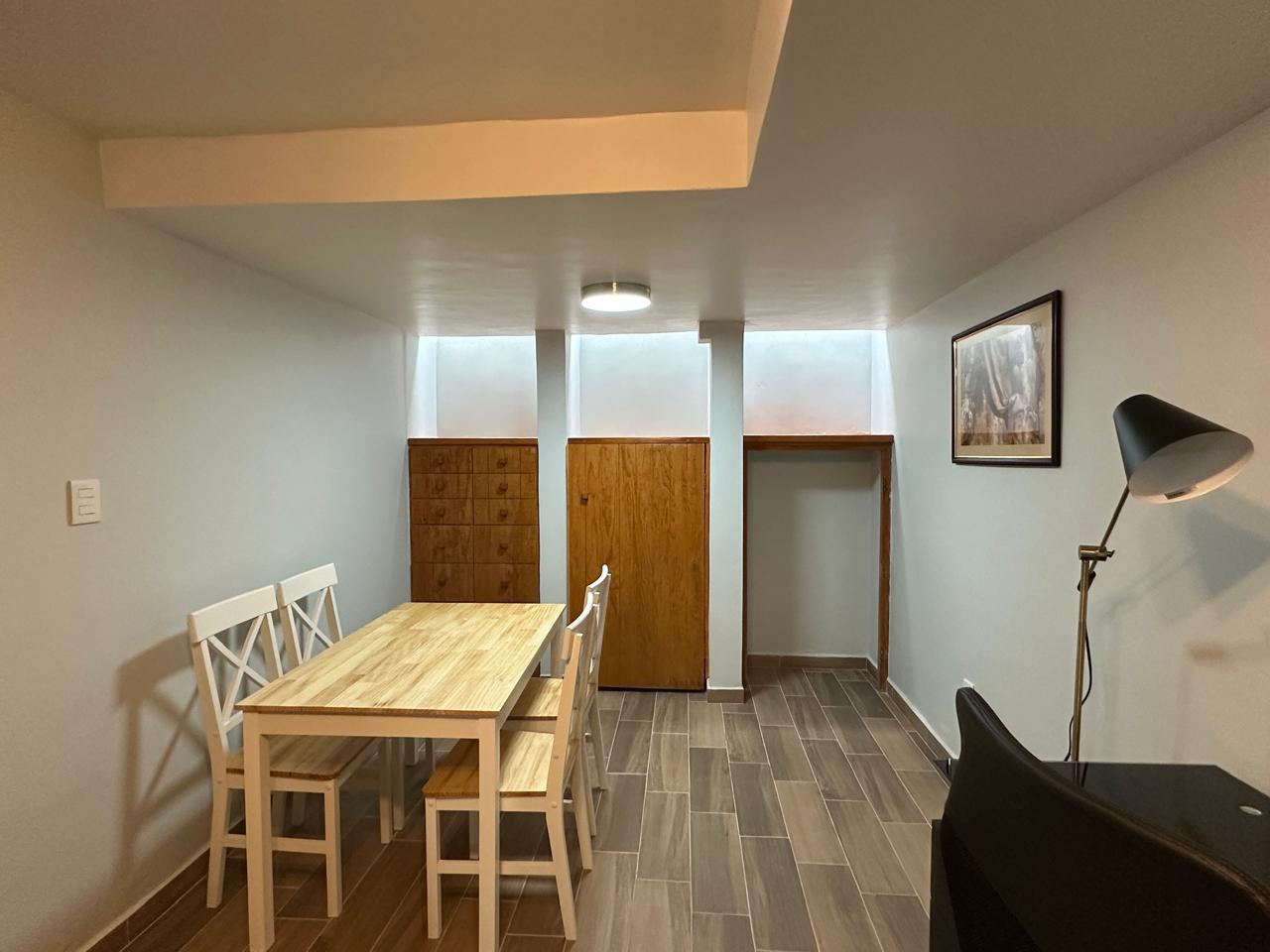Pequeño loft amueblado en planta baja, amplio espacio abierto, parrilla eléctrica y fregadero, cuenta con baño propio y área para el auto sin techar.