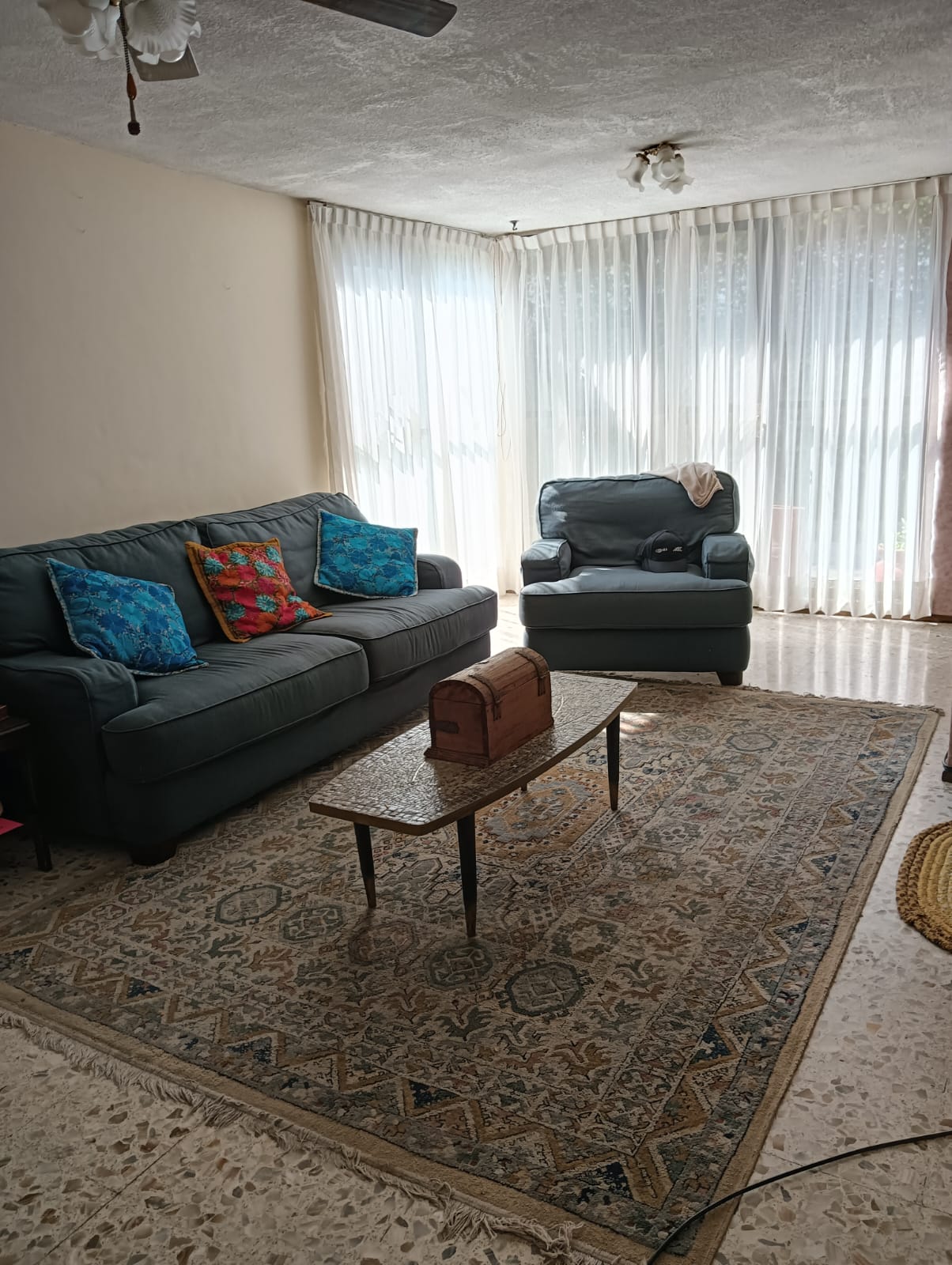 Casa de una planta con sala comedor corridos muy amplios, tres recamaras, dos y 1/2 baños, sala de TV muy amplia, cocina equipada- desayunador, cuarto de servicio y de lavado, bodega, jardín de 100 mts y garaje para cinco autos.