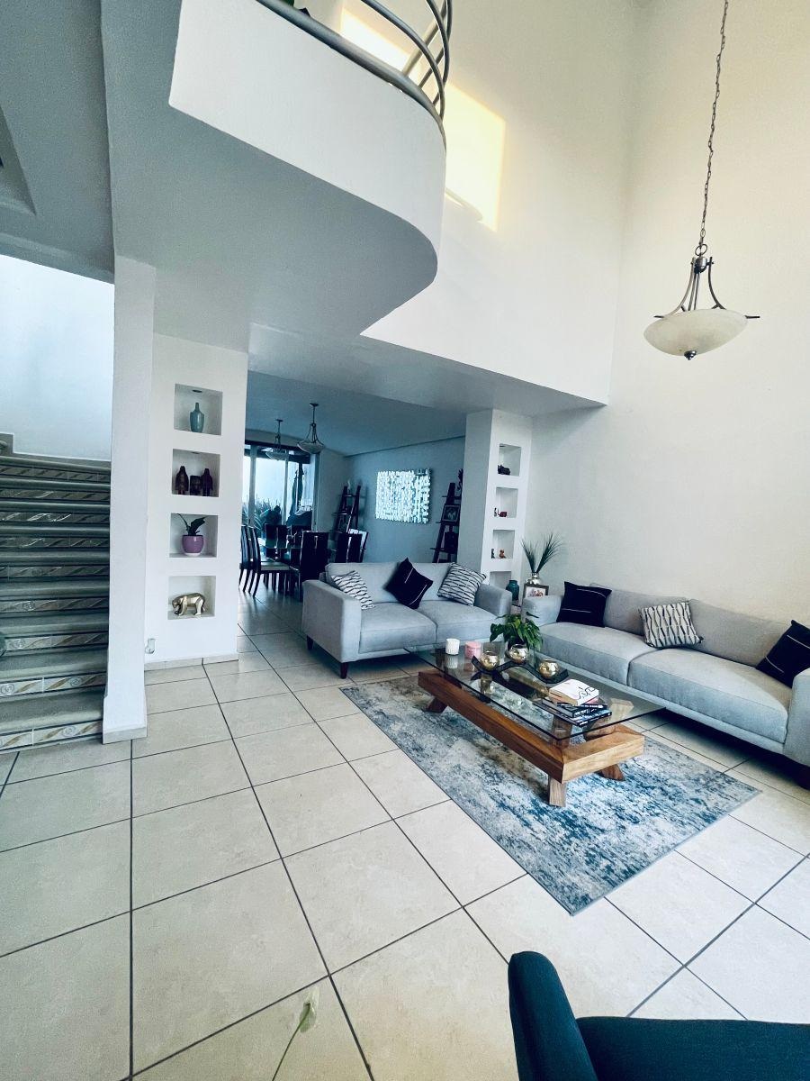 En planta baja encontrarás sala y comedor corridos; la sala tiene doble altura y chimenea eléctrica, lo que hace el espacio más cálido y agradable. La cocina es amplia, equipada y con buena capacidad de alacena; tiene vista al jardín y espacio para desayunador.